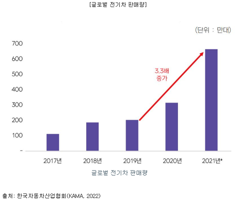 - 전방산업인 EV 시장은 2022년부터 2030년까지 연평균 약 19.97% 증가할 것으로 전망되며, 2030년에는 글로벌 전체 자동차 판매 대수 대비 전기차 비중이 약 40.95% 정도 차지할 것으로 전망. 2021년 글로벌 전기차 판매량은 2019년 대비 3.3배 증가.