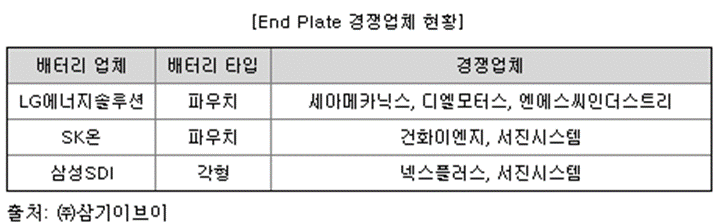 - End Plate의 경우, 파우치형과 각형에 필요한 부품이지만, 원통형에는 적용이 되고 있지 않기에 배터리 셀 폼 팩터의 주도권이 원통형으로 넘어가면 End Plate 탑재의 필요성이 없어질 가능성 존재